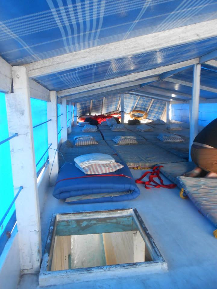 We boarded and found our sleeping quarters, about 20 sun lounger mattresses scattered over the top deck, with a few large blue tarps roped to the sunburnt wooden rails of the platform.